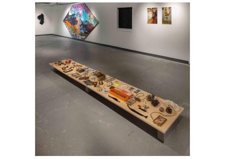 Jungil Hong, "Dinner Table," 2024. Various objects. 10” x 144” 42”. Installation view, “The Time Being,” ODD-KIN in East Providence, RI, 2024. Courtesy of ODD-KIN.