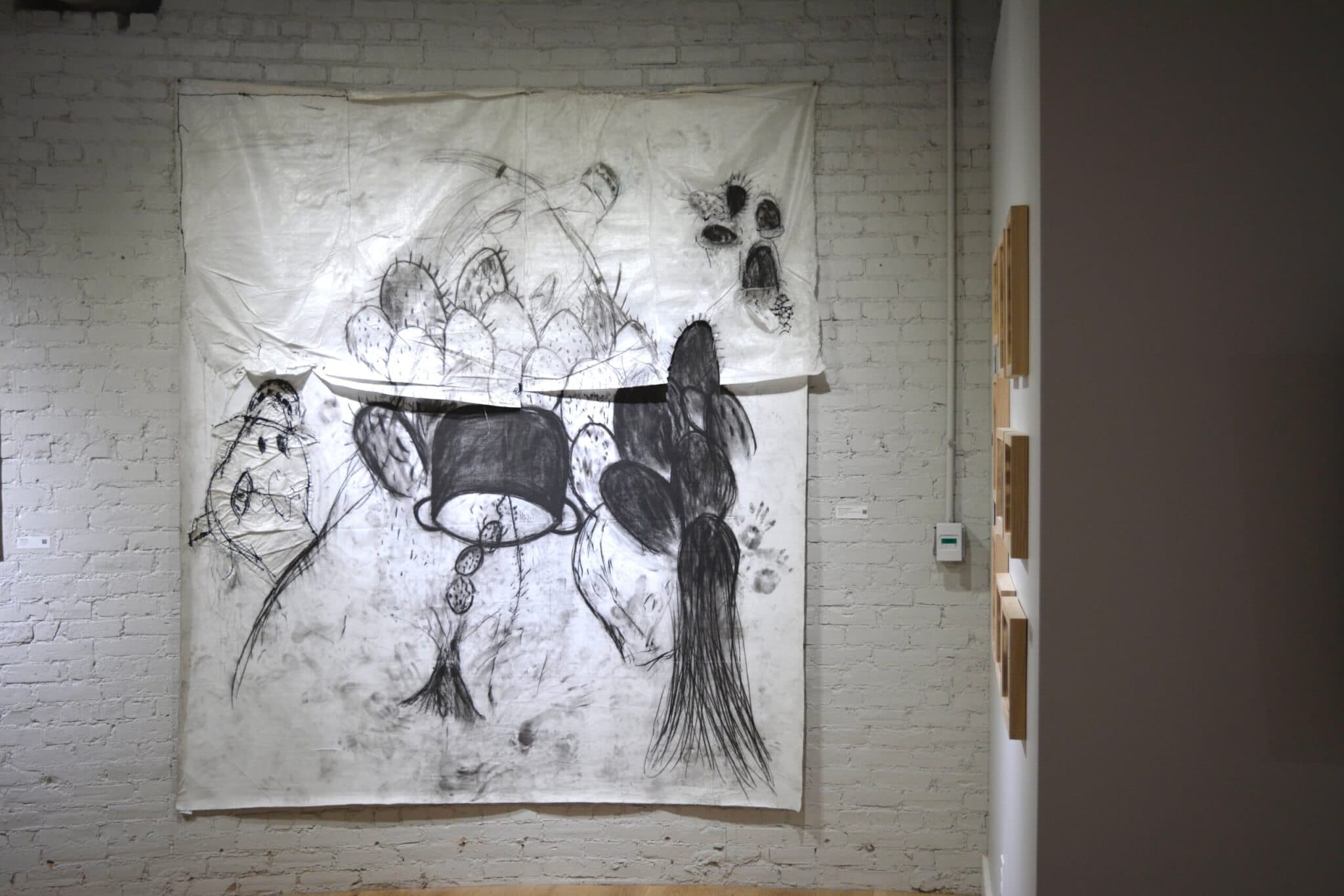 The show is split between Unbound Visual Arts (UVA) and the Brookline Arts Center (BAC), both of which introduce the show with an emphasis on landscape. At UVA, it opens with The Garden (2024) by Fouad Tomb, Maroun’s son. Fouad’s cacti prickle up from the land in streaks and blobs of gentle color—green and yellow cactus pads dolloped with bright red cactus flowers. The Palestinian identity is formed around the land and what grows from it, these natural forms bearing witness to the violent history that has transpired since 1947 and serving as symbols of resistance. Tomb’s cacti are as bright as they are sharp. At the BAC, Noel Maghathe’s Through the Olive Trees (Younis) (2024) untethers this landscape, using sheer fabric staged over a window to derealize the Palestinian land, with a cold Boston hovering behind it. Existence for Palestinians is fractured—an image of home only available through translucent fabric—another city, skyline, and history forever imposed on top of their land.
