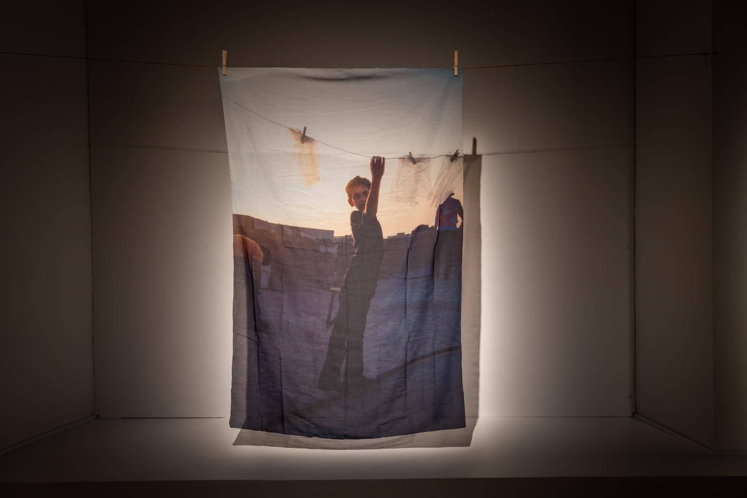 Noel Maghathe, Through the Olive Trees (Younis), 2024. Dye-sublimation on synthetic chiffon, 41 × 26 in. Image Courtesy of Brookline Art Center.