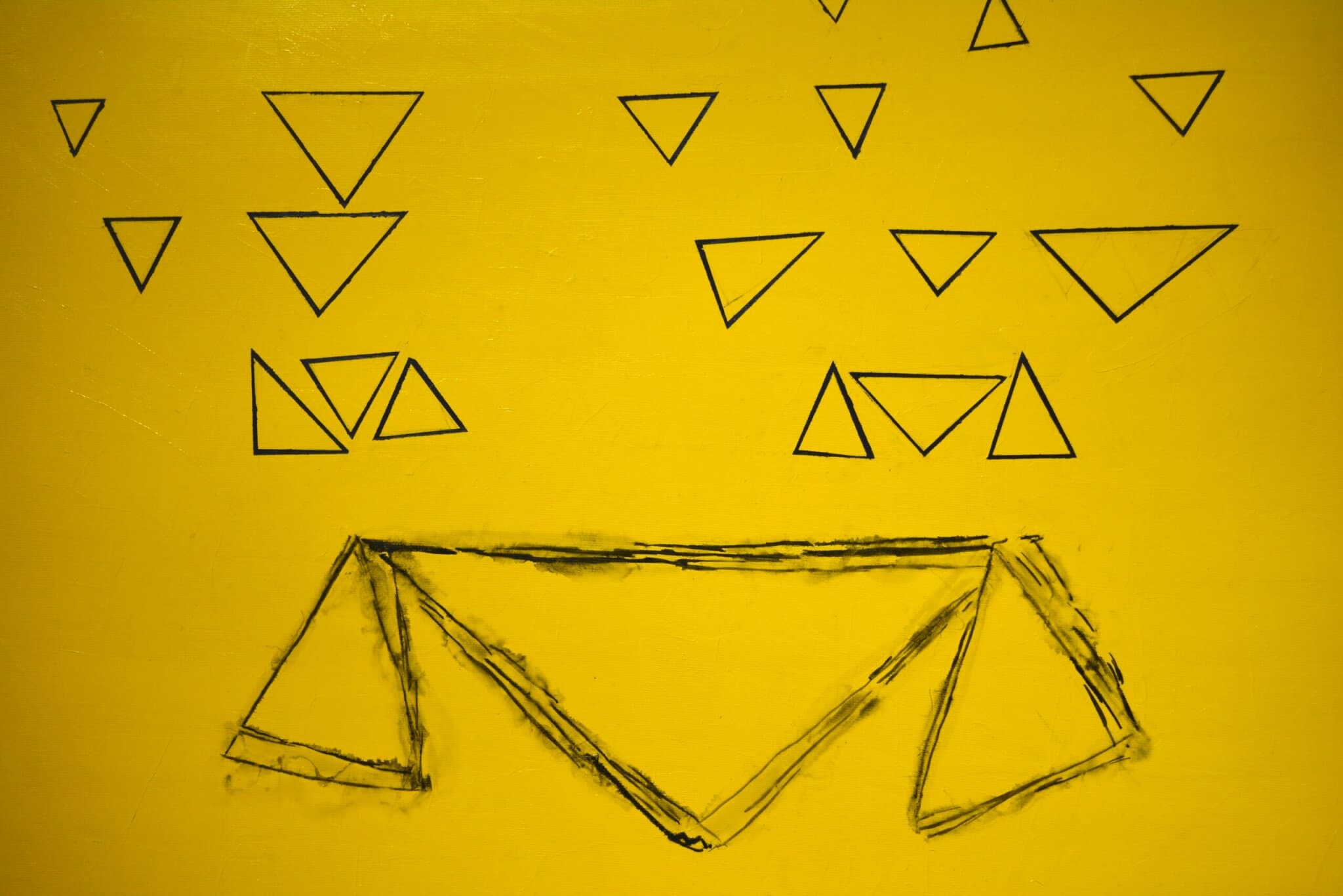 There is Raed Issa’s series Diary of Displacement (2025), made of hibiscus, coffee, and tea on paper, the only materials available after repeated displacement left the rest of Issa’s work lost beneath rubble. And Maria Saleh Mahameed’s Sabra Clay Pot (2025) depicts a tumbling ceramic pot spilling its contents from a bush of sabra, or prickly pear cactus. Done on a polypropylene bulk bag sewn into canvas, Mahameed composed the work on the floor, her body smashed into the surface, leaving a streak, a smudge, a handprint. And while the empty pot speaks of loss, the marks of her body reveal the artist at work, moving above the piece, embodied, alive, and still creating. To the left of Mahameed’s work is Zohdy Qadry’s startling The Tent (2024), a compact oil-on-canvas painting. Qadry strips away landscape, leaving a spattering of black triangles over an anxious, yellow-washed canvas. Even with just the scratchy, wavering geometry of the tents, the piece hums with life. It’s a life that is disassembled and repitched somewhere new—a nervous, transient state of perpetual fleeing.