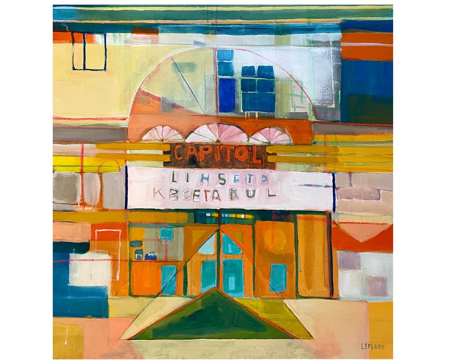 Bonita Leflore, an artist based on the North Shore, often paints aging architecture, giving glow-ups to dilapidated barns and sagging structures that might be called eyesores, locating beauty in imperfection and impermanence. Here, in her acrylic-and-pastel paintings of the Wood and Strings Music Center, the Arlington Reservoir Water Tower, the Cyrus Dallin Art Museum, and the Capitol Theatre, perspective sometimes turns kaleidoscopic (showing us the front and side of the Dallin Museum simultaneously, for instance), and vibrant palettes pull from imagination as much as observation. Consider the juicy tangerine and pops of teal and cobalt in her take on the Capitol, a six-screen movie house that will turn one hundred next year. The inviting colors and abstracted geometry of the painting had me contemplating the many sides of this place and the different ways it welcomes the community. The Capitol has an ice cream parlor as well as the standard concession stand. Mondays offer matinees so caregivers can watch a movie for grownups in a setting where babies can be babies. It’s a popular venue for birthday parties; you can rent out a whole theater for about the same price as a nice dinner for two. On Saturday nights, you can catch DIY music and live visuals courtesy of the 4th Wall. And the next morning, you might find a congregation worshiping there.