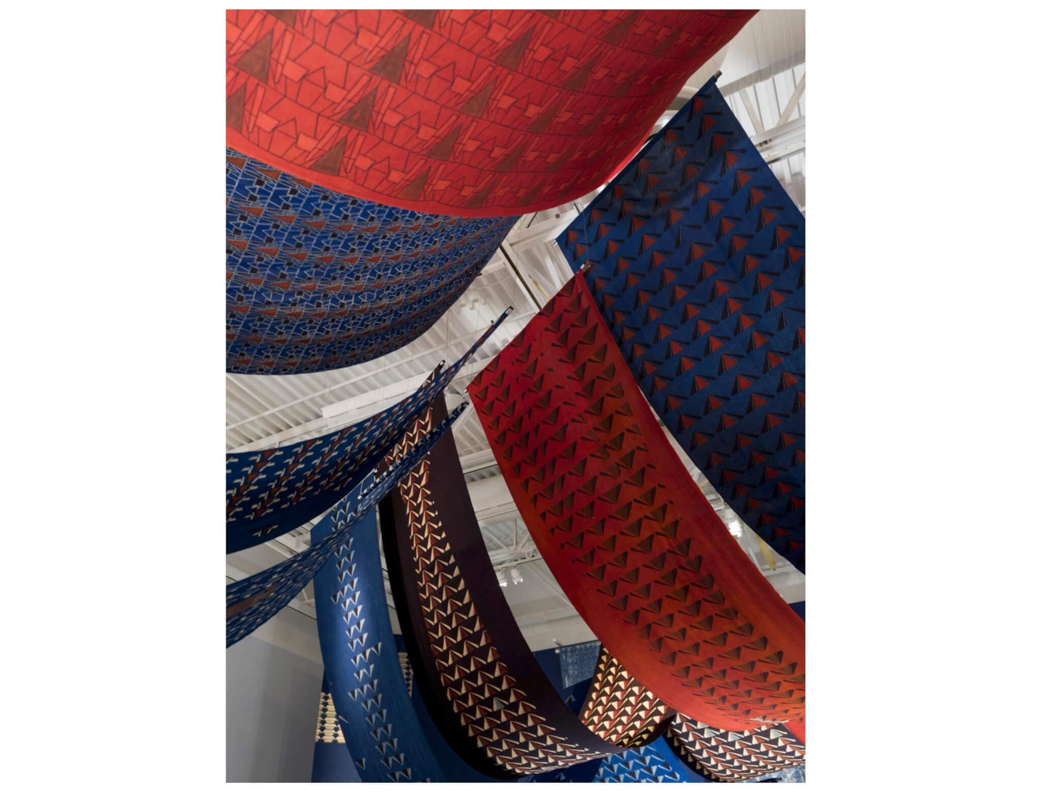 When you enter “Swapnaa Tamhane: Spaces That Hold,” curated by Siddhartha V. Shah and on view at the Mead Art Museum, you are invited into a space, a structure, a place. The implied fabric structure is constructed from multiple suspended ajrakh textiles—long yardages of block-printed fabric featuring geometric patterns and natural dyes. The form of the shape created via the fabric itself evokes the domestic, with its pointed roof and allusions to rooms or room dividers, yet it transcends the home through the austere nature of the space and the quietude of the museum, suggesting instead a sacred environment.