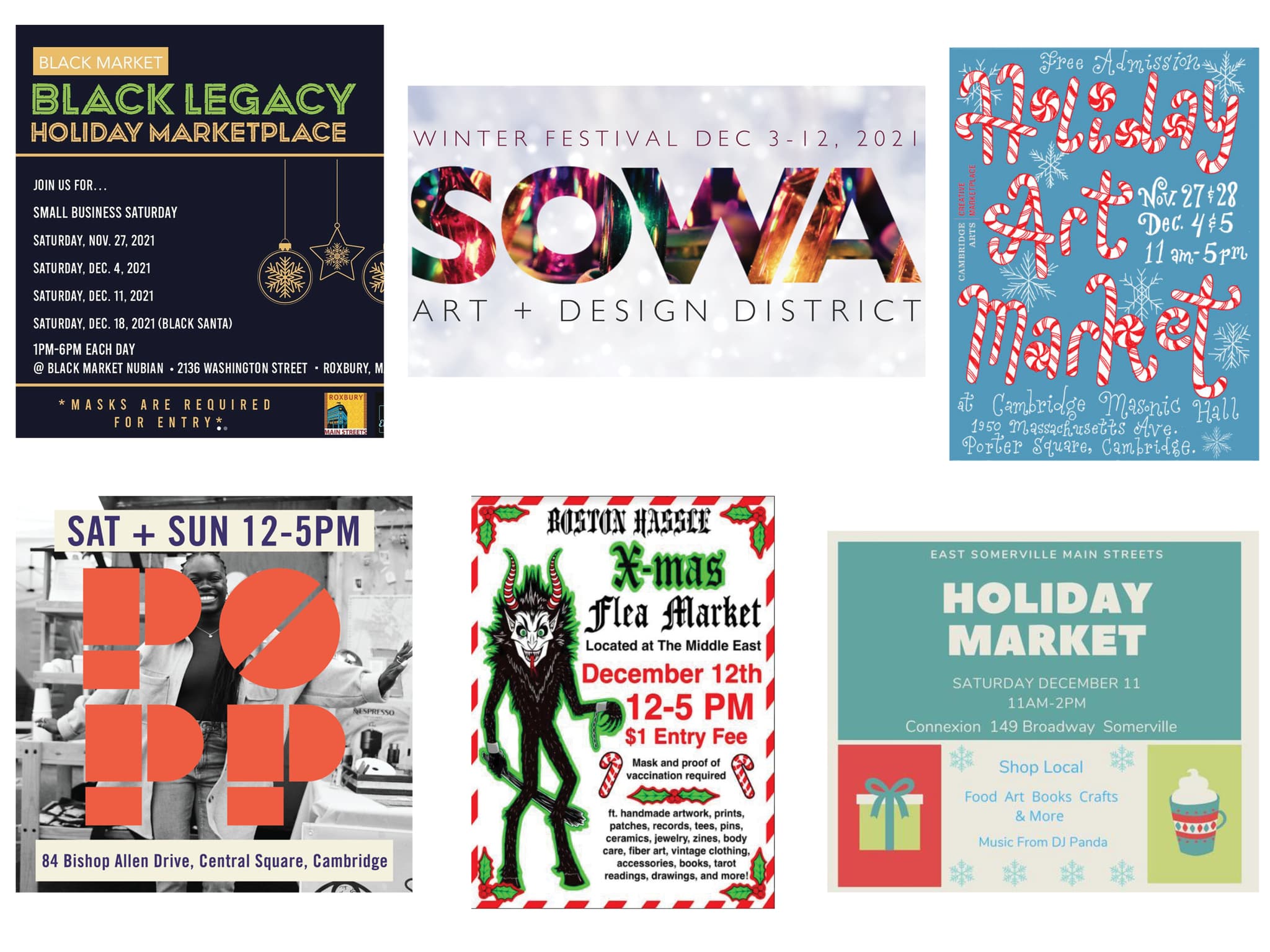 Clockwise from left: Black Market Nubian Square, SoWA, Cambridge Arts, Connexion, Boston Hassle, Central Square BID.